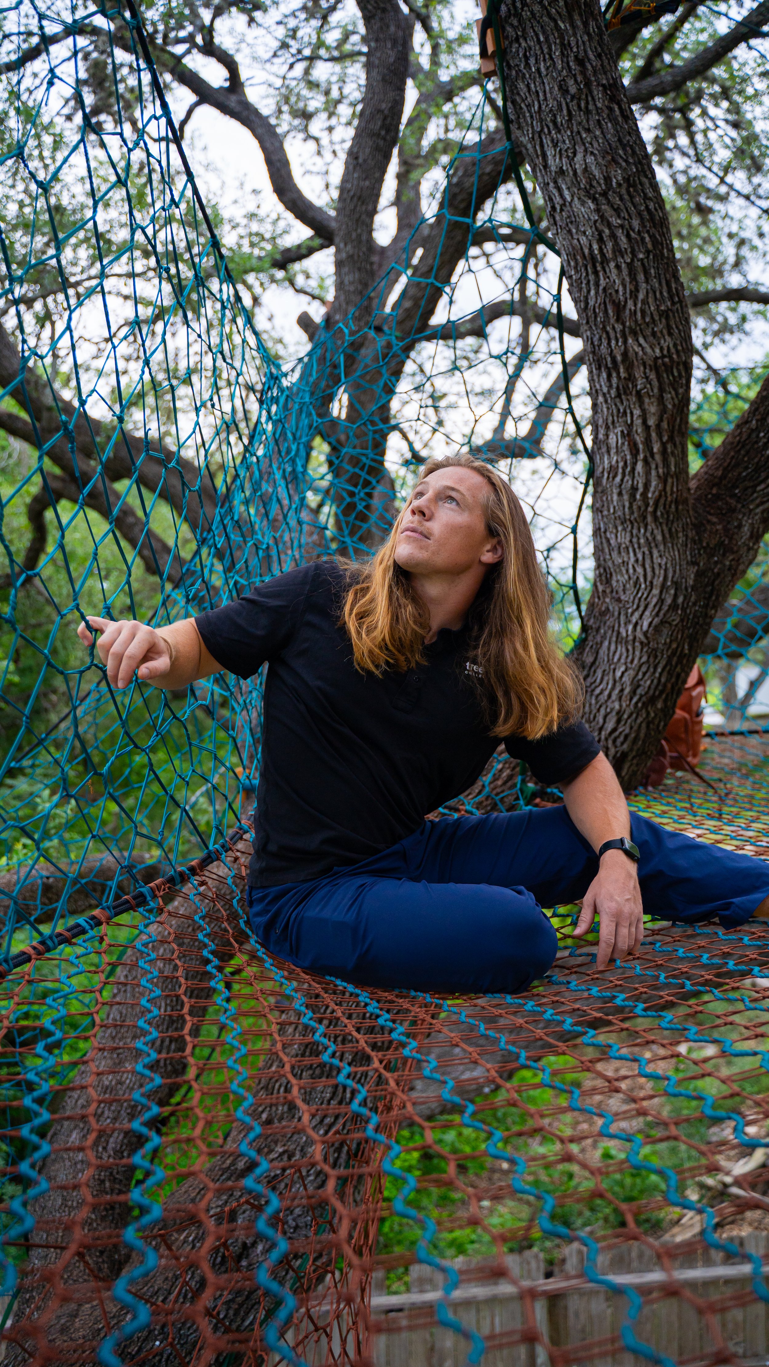 We came to Seguin and wove the net directly into Parisa’s branches, dialing in the tension by hand to create something that feels tight, bouncy, and deeply comfortable. To keep travel costs down, we brought our Sprinter van and set up camp along the river—living and working in the space for over a month. Evenings were spent fifteen feet up in the oak, listening to frogs and cicadas, talking long after the tools were put away.